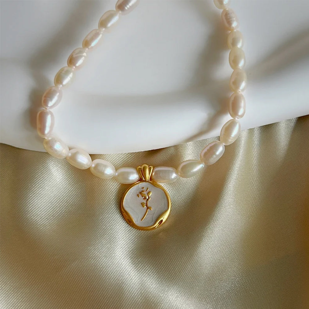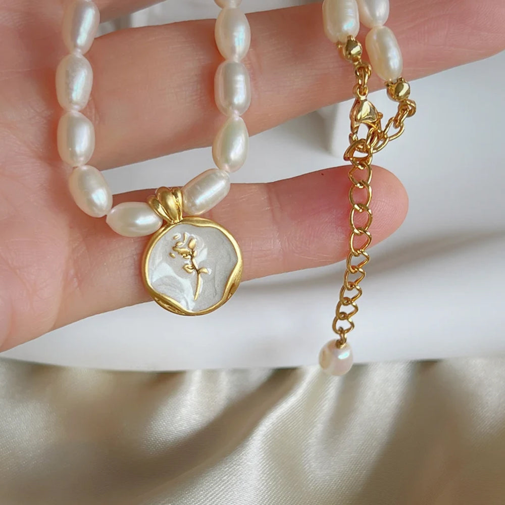 A francia romantika és a vintage nőiesség letisztult esszenciája. A lágy fényű gyöngysor finoman kiemeli a nyakat, a gyöngyházfényű, kézzel zománcozott virág medál pedig (rózsa vagy tulipán motívummal) azonnal különlegessé teszi a megjelenést.